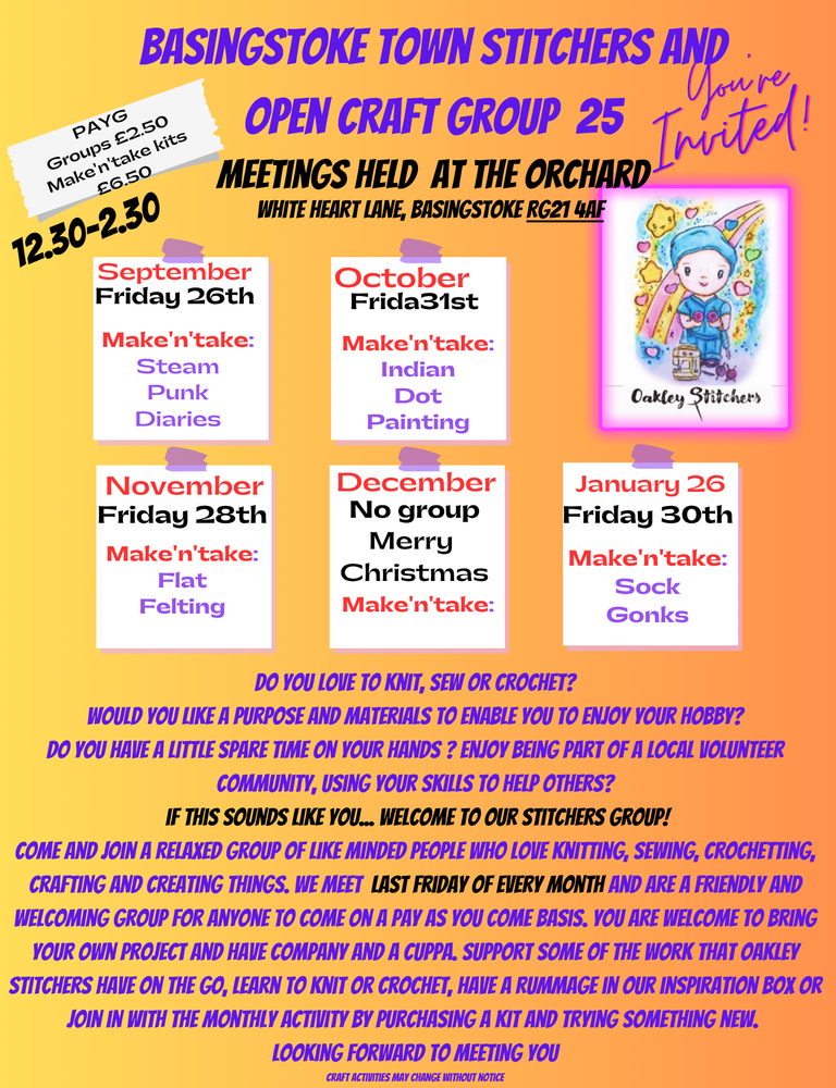 Open Stitcher and Crafters groups are pay-as-you-go (PAYG) and have an entry price of £2.50 per person to cover the costs of the hall and refreshments. Activities are on a make and take basis, kits can be purchased for an additional £6.50 which includes everything that you need to take part in the activity provided, something new to try each month (please see our posters below for the months craft activity).